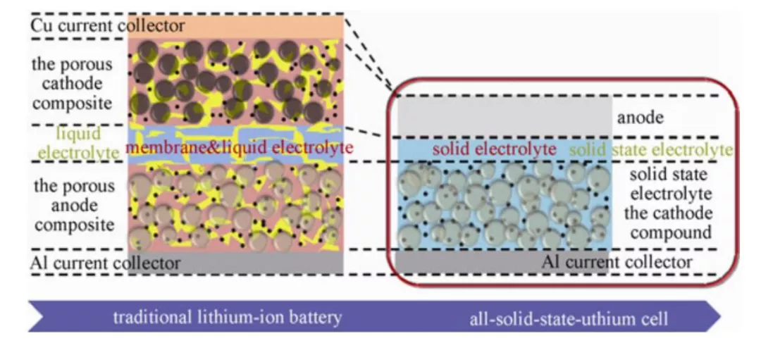 相较液态电池,固态电池拥有三方面的优势:(1)高安全:有机电解液的热分解温度在160℃左右,氧化物固态电解质的热分解温度均在500℃以上,用固态电解质代替液态电解质,可以大大降低电池热失控风险;(2)高比能:固态电解质电化学窗口在5V以上,远高于现有体系(4.3V左右),可以适配活性更高的高比能正负极材料,显著提升电池的能量密度。搭配锂负极的固态电池能量密度有望提升至500Wh/kg,接近现有高镍三元电芯的2倍,有望彻底解决新能源汽车的里程焦虑;(3)低成本:固态电池无需使用隔膜,内部本身为串联结构,在系统集成端无需外部线束进行串联。同时因其较高的安全性,可以简化冷却系统,在PACK层面成本优于现有电池体系。因此,固态电池被公认是下一代高比能锂离子电池体系。
