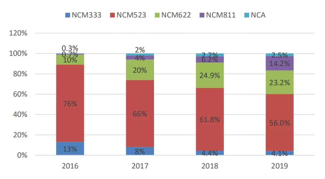 未来高镍三元仍是主流。虽然磷酸铁锂占比有所回暖,但2020年工信部第一批乘用车推荐目录中仍有82%的车型搭配三元电池,在乘用车领域三元仍占主导地位。从三元产品结构来看,高镍化趋势显著。当前国内三元市场以中镍三元为主,其中市场份额最大的NCM523呈现下滑的趋势。而低镍三元由于能量密度较低,成本优势下降,市场份额逐年被压缩。相反,高镍NCM811占比持续增加,2019年市场份额同比增速达129%,增幅显著。NCM622由于与NCM523差异较小,部分企业会越过NCM622,直接升级至NCM811,预计其占比有望维持在23%左右。对于NCA,由于国内企业一直无法突破其较高的技术壁垒,在国内市场的份额占比较低。但随着外资动力电池企业的进入和Model 3产能的释放,其占比有望进一步提升。