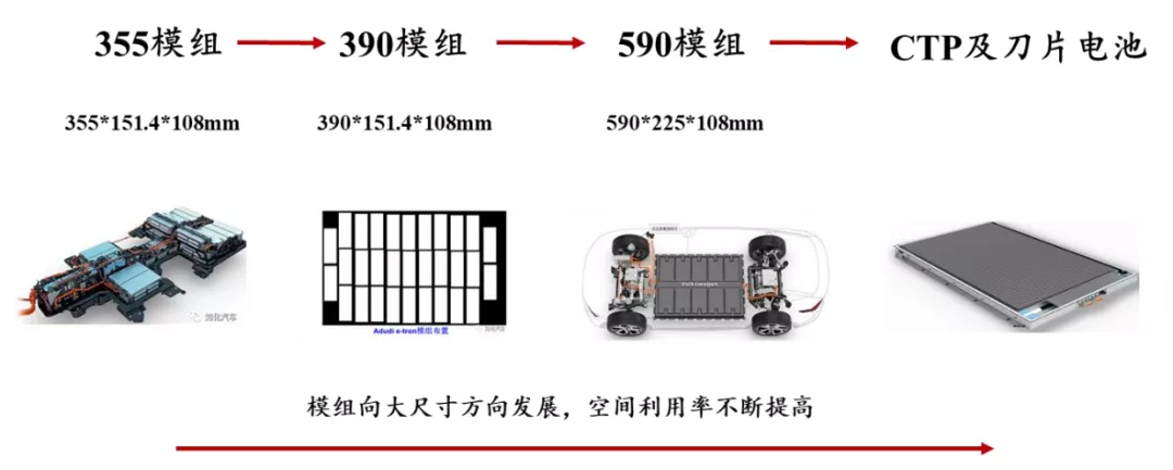 模组技术往大尺寸方向发展。新能源汽车初期阶段,大部分底盘是油改电平台,其装载的电池空间各不相同,导致对模组和电芯尺寸需求各不相同,而电芯尺寸种类较多的劣势显著。随着德国汽车工业协会推出电池VDA标准尺寸,大众推出VDA标准355模组,模组集成走向标准化的道路。随着新能源汽车发展的深入,各车企陆续推出基于电动化的整车平台,装载电池的底盘空间有所增大和形状更加规整,模组集成往大尺寸和高容量方向发展,空间利用率和成组效率不断提高。伴随着电池模组越来越大的趋势,宁德时代和比亚迪分别推出了CTP、刀片电池技术。