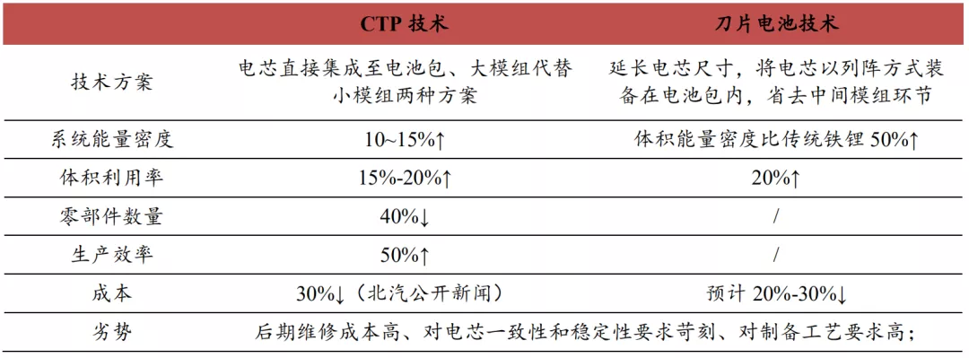 CTP和刀片技术,有助于提升系统能量密度和降低成本。传统电池包的集成路线为“电芯-模组-Pack”。CTP和刀片电池技术本质均为工艺层面(电池结构)创新,通过延长电芯尺寸,减少中间模组环节,直接从电芯集成至Pack,有利于提高系统集成效率和减少零部件,进而达到显著提升系统能量密度和降低成本的效果。以CTP技术为例,宁德时代官网数据显示电池包的系统能量密度可以提升15~10%,零部件数量可以减少40%,生产效率可以提升50%,对整个电池工艺有着性变革。