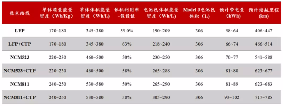 注:CTP体积利用率提升按15%计,Model3电池包体积按拆解估计,三元的百公里电耗按 13kWh计,LFP的百公里电耗按 14.3kWh计