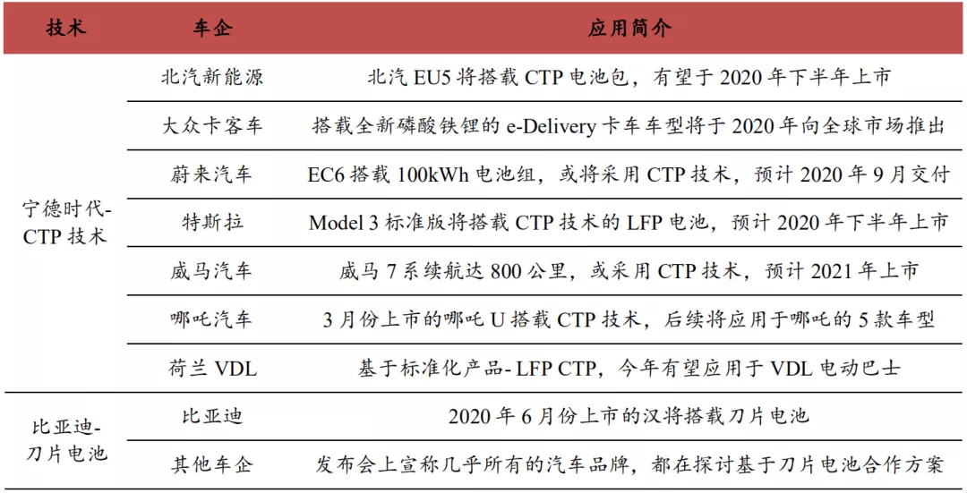 助力龙头企业筑造技术壁垒,巩固行业定位,拓展海外市场。宁德时代CTP技术知识产权超过200项,比亚迪刀片电池技术核心专利超过300项,两者均为龙头企业筑造了较高的技术壁垒。宁德时代CTP技术有“无模组”和“大模组” 两种方案,其中“大模组”方案对车型的适配度较高。据不完全统计,国内下半年有5款搭载CTP技术的车型上市,其中不乏明星车型Model3和蔚来EC6等,届时有助于宁德时代进一步提高国内市场占有率。同时基于CTP技术的磷酸铁锂电池在大众卡客车型和荷兰VDL车型上的应用,将有助于宁德时代拓展海外市场。而比亚迪刀片电池技术有助于发挥其磷酸铁锂龙头企业的优势,助力其挖掘新的国内外动力电池客户。