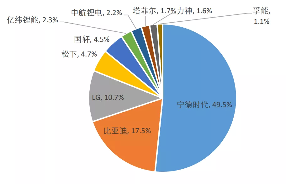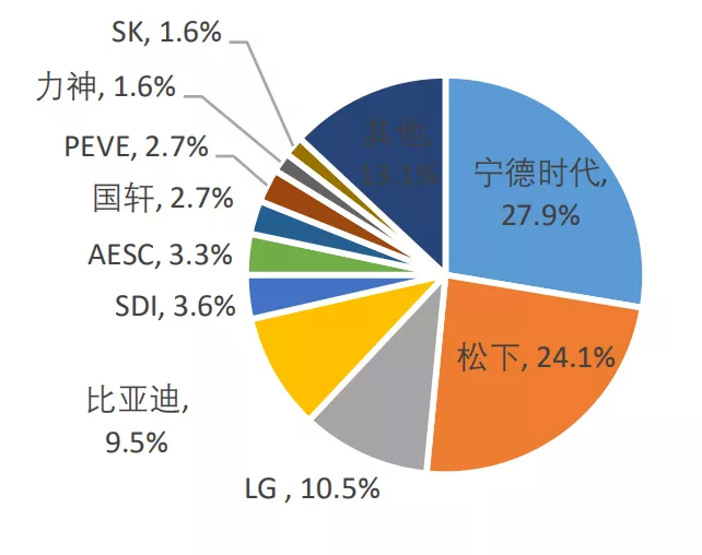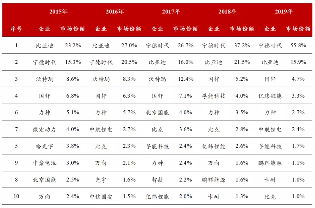 集中度逐年提升,龙头企业优势显著。2018年、2019年CR10市场份额分别为81.3%、89.7%,行业集中度持续提升。2019年宁德时代市场份额高达55.8%,占比首次过半,同比增速达50.1%, 增幅显著;比亚迪市场份额为15.9%,同比下滑26.1%。与此同时,二线企业生存空间明显压缩,2018年底国内动力电池企业还剩90多家,而2020年有电池装机的动力电池企业只剩38家,行业洗牌加剧。2019年TOP10企业中,除了宁德时代,只有亿纬锂能和中航锂电两家市场份额呈正增长,剩下的7家企业均出现不同程度的下滑,除了国轩下滑9.2%,其余6家降幅均在20%以上,降幅显著。