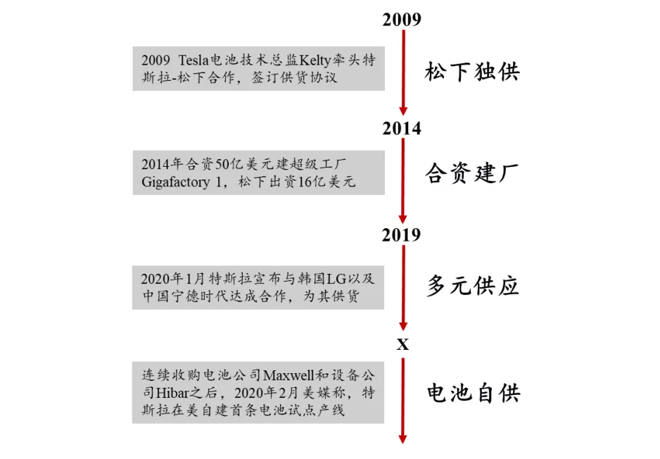 二线企业仍蕴藏生机,未来有望形成一超多强的格局。作为新能源汽车行业的领军企业,特斯拉对动力电池供应商的选择经历四个阶段:(1)松下独供:发展初期,特斯拉从技术与品质优先的角度出发,选择松下作为其唯一的供应商;(2)合资建厂:发展中期,特斯拉动力电池需求旺盛,与松下合资建立超级工厂,形成深度绑定关系;(3)多元供应:产能爬坡期,与松下关于产能扩建与电池成本等方面矛盾凸显,特斯拉从成本、品质、规模优先的角度引入LG和宁德时代;(4)电池自供:随着2019年先后收购电池公司Maxwell和电池设备公司Hibar,2020年2月自建电池试点产线,未来特斯拉电池自供的规划逐渐清晰。其他新能源汽车企业对动力电池供应商的选择,大概率也会经历上述四个阶段,届时对动力电池的格局有着较大的影响。