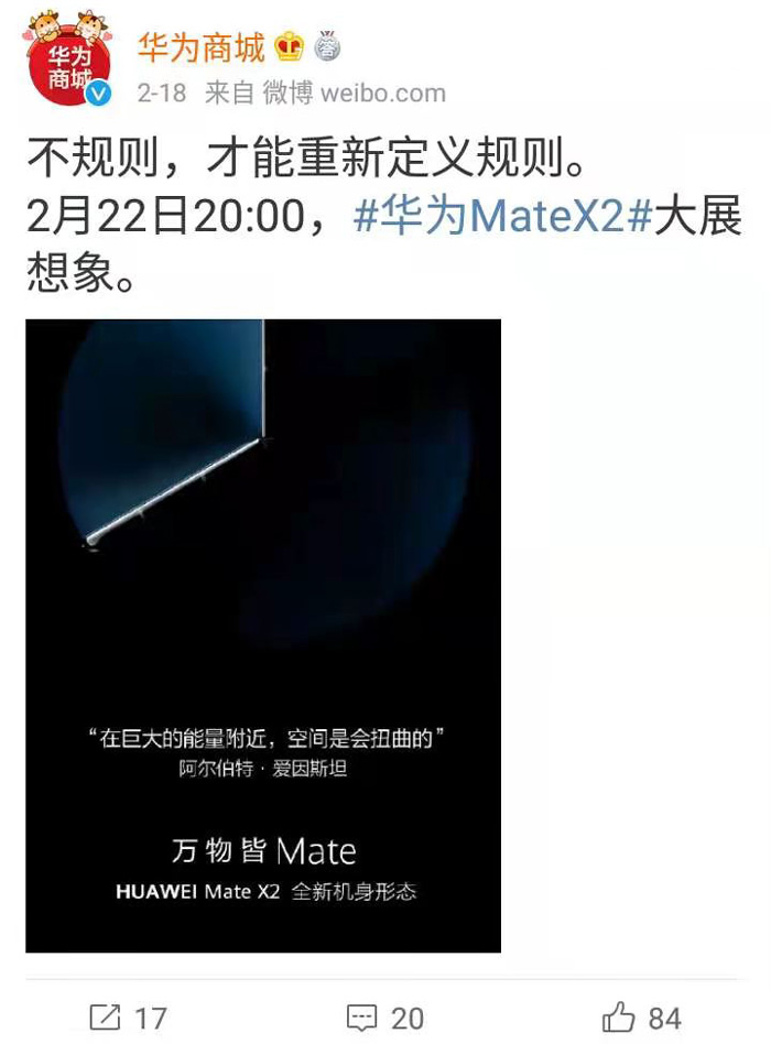 很多人以为P50是华为今年的第一款旗舰,然而实际上并非如此。根据华为近日发布的消息,华为一款高价位机型即将发布,这款新机的型号是Mate X2。从这个型号名称可以看出,这是一款折叠屏手机,而华为发布的海报显示,这款手机的广告词是:在巨大的能量附近,空间是会扭曲的。华为商城同时配图:不规则,才能重新定义规则。