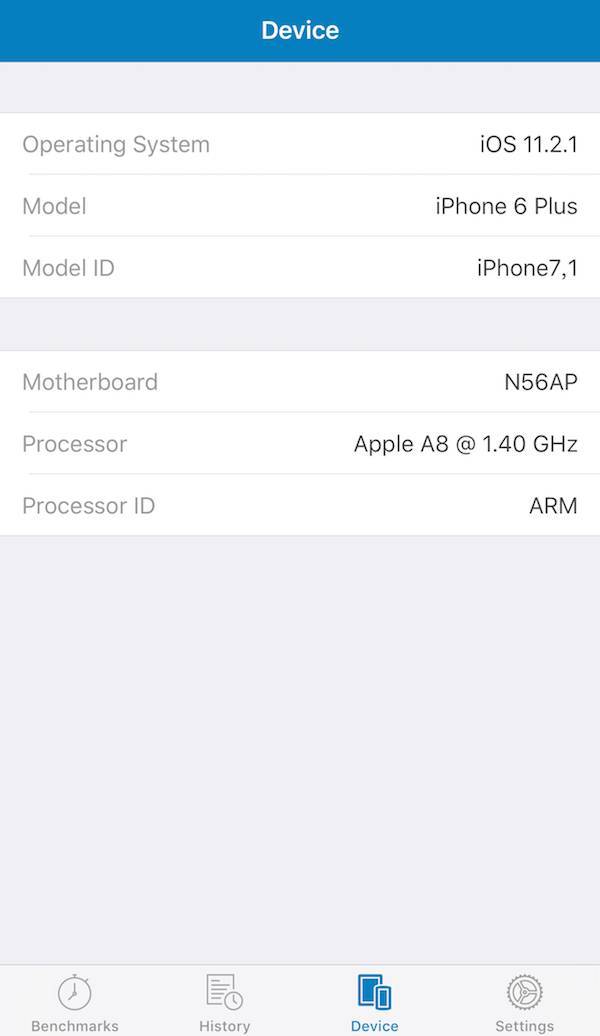 前期准备工作,我们从编辑部同事 @早优夫斯基 那里找到了一部已经「退役」许久、摔破了一角的 16GB 版本 iPhone 6 Plus,同时将其系统更新至最新 iOS 11.2.1 版本并重置手机。有关测试,我们选择了 GeekBench 4、安兔兔、微博、王者荣耀四款软件。