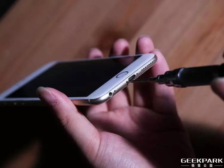 拆解部分没有太多值得赘述的地方,关机之后,首先用螺丝刀将底部 Lightning 接口两侧的螺丝拧掉,然后借助吸盘将前面板取下即可。