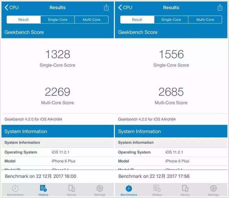 在旧电池以及更换新电池之后,我们分别利用 GeekBench 4 对 iPhone 6 Plus 进行了测试(CPU 部分)。从最终的结果来看,旧电池状态下,CPU 单核得分为 1328 分,多核为 2269 分;新电池状态下,CPU 单核得分为 1556 分,多核为 2685 分。