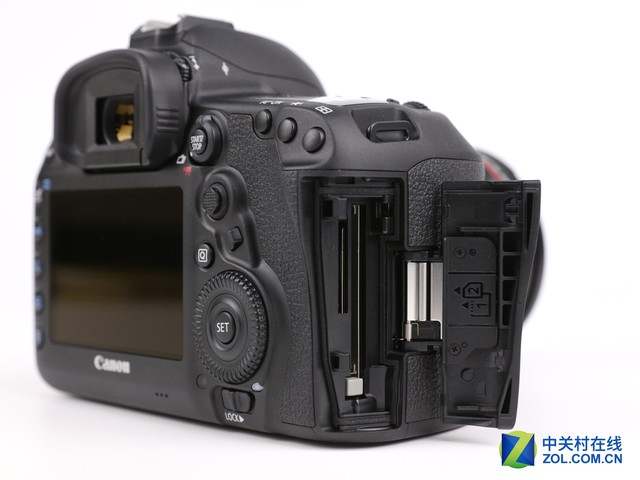 从机身来看,机身正面虽然造型上没有丝毫变化,但是右侧细节有所改动。一直以来放在机身右下角的机身代数表示,也就是MarkIV放在了5D下方,因为原来右下角的位置多了一个同步接口,这个接口与1DXMarkII相同。卡槽方面,佳能5D4并没有采用CFast卡,而是同样采用了SD+CF双卡槽。