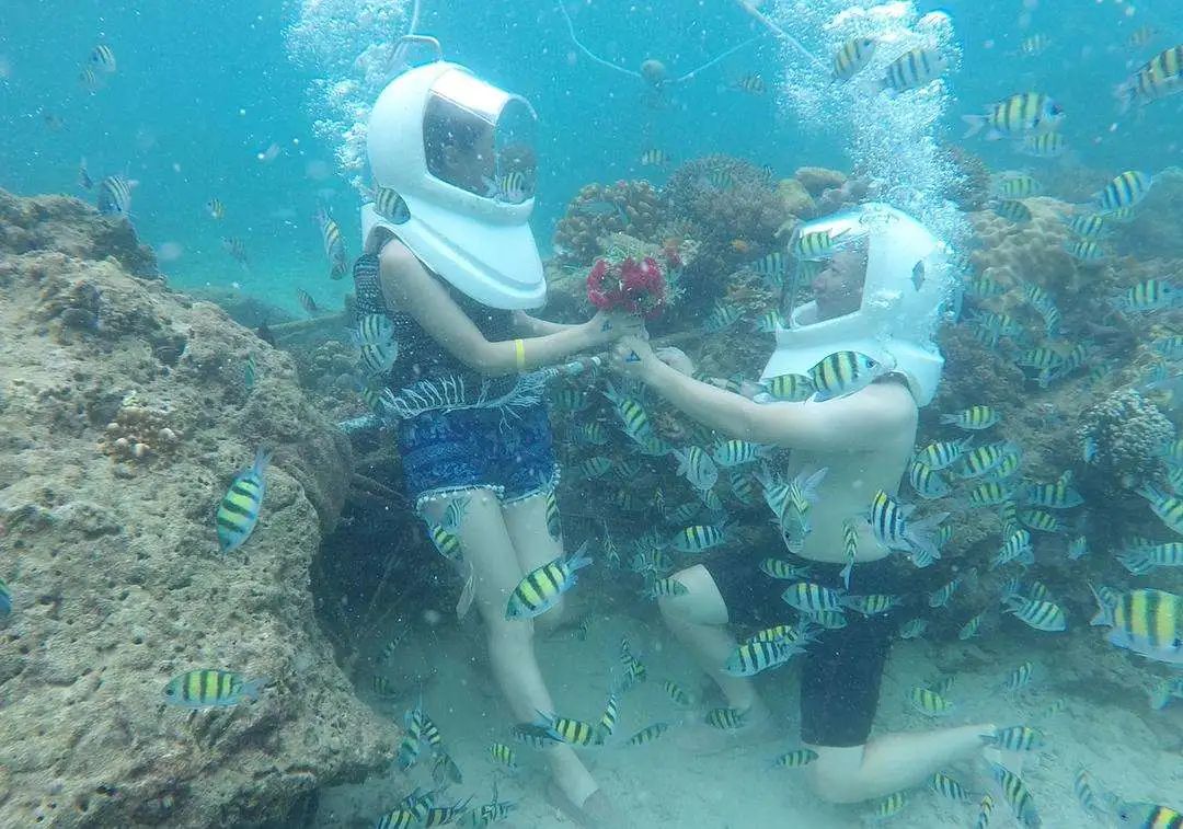 海底漫步:不论男女老幼,不论是否熟悉水性,只要穿着潜水服装,经简单的培训,配有一个可供压缩空气的头罩就可下到海底漫步了。漫步的感受同陆地上一样,无任何呼吸障碍。珊瑚岛的海底漫步费用约300人民币/人。