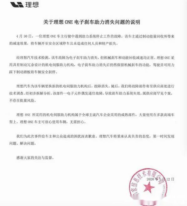 关于电动车着火事件,最近的一起是湖南长沙一辆理想ONE前机舱冒烟。理想汽车最近是麻烦不断,今天,理想汽车就“刹车失灵”给出官方说明:经技术检测,该车故障为电子刹车助力消失,但机械刹车和动能回收减速均正常。