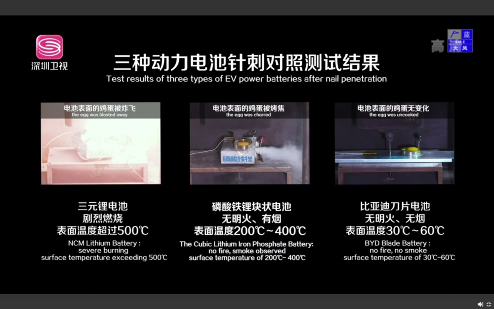 因为三元锂电池针刺后,容易起火爆炸;而普通磷酸铁锂电池和新的刀片电池,表现多少都比三元锂要好。