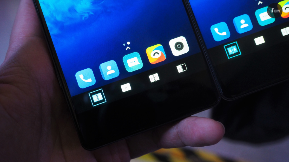 第二种模式叫做分屏模式,这个模式类似于原生 Android 中的分屏模式,可以在两块屏幕时同时使用两个 app,只不过 Axon M 是通过硬件来实现的。