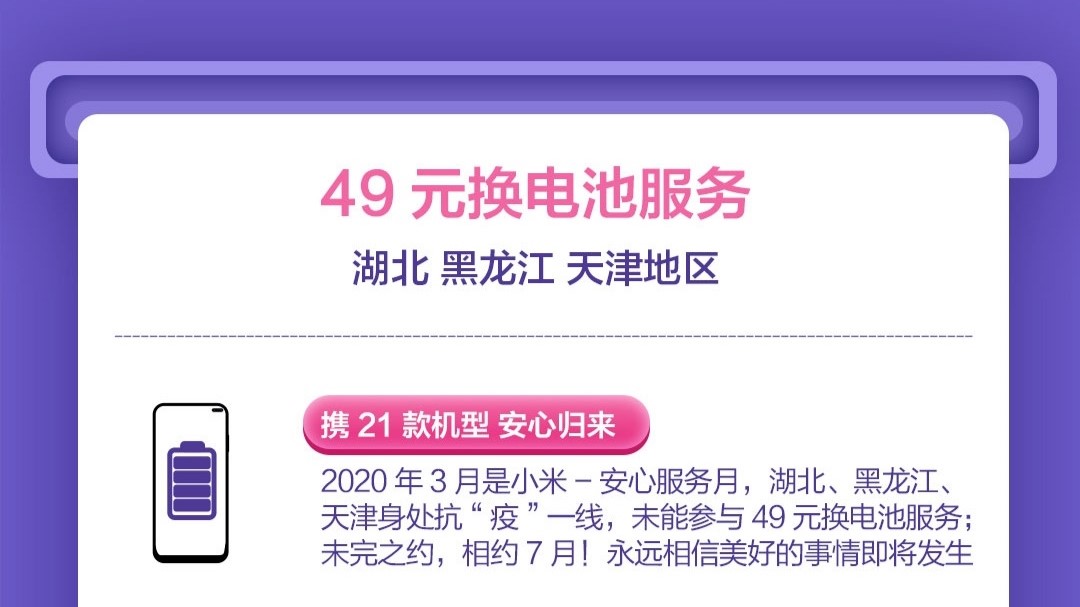 此次小米安心服务月的对象只有湖北、黑龙江和天津三地,因为三月份时他们正处在抗“疫”一线日特别为这三地的小米用户开启49元换电池的活动。