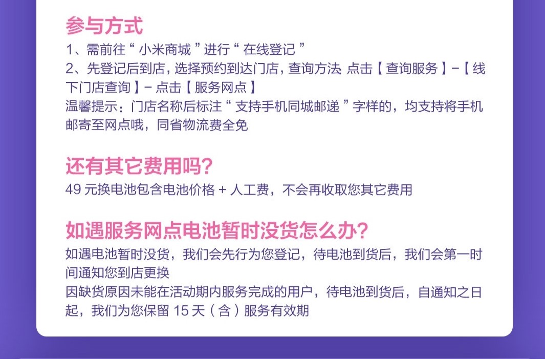 湖北、天津、黑龙江的小米用户参与此次活动需要现在小米商城进行在线登记,然后预约到达门店进行更换即可。49元包换电池和人工费,没有其他费用。