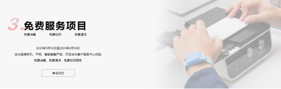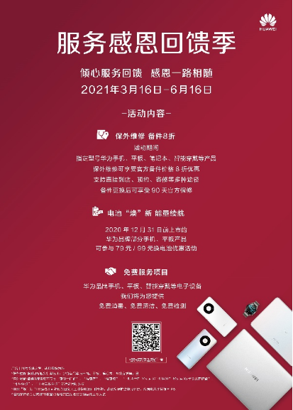 为持续提升服务品质、进一步升级用户的使用体验,从3月16日到6月16日,华为开展了为期三个月的“倾心服务回馈,感恩一路相随”的优惠活动。活动期间,华为部分产品都能够享受保外维修换备件八折、电池换新、免费清洁等服务。诸多福利不仅为用户带来手机常用常新的体验,同时也延长了手机的使用周期。