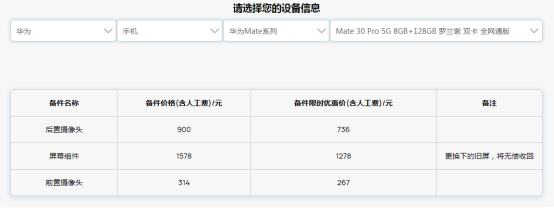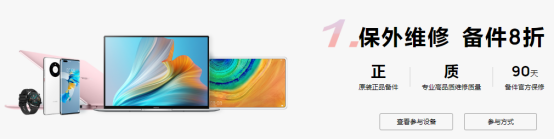 华为品牌部分智能手机、平板、笔记本、穿戴产品,保外维修更换备件都可以享受到原备件价格8折的优惠。比如我现在用的华为Mate30Pro如果需要替换屏幕,原价1578元,现在只需1278元就能换一块原装全新屏幕,即安心又超值,而且更换后还能享受90天官方保修。