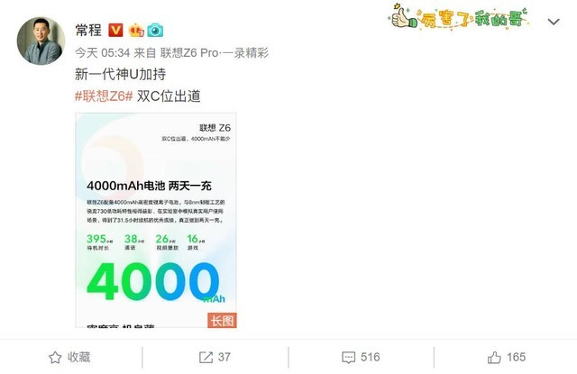 常程在微博中公布了联想Z6的电池容量为4000mAh,并支持15W QC3.0快充,官方配备18W快充头。