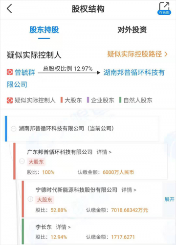 天眼查显示,湖南邦普是广东邦普循环科技有限公司(简称“广东邦普“)的全资子公司,宁德时代控股广东邦普52.88%。