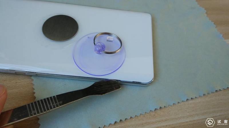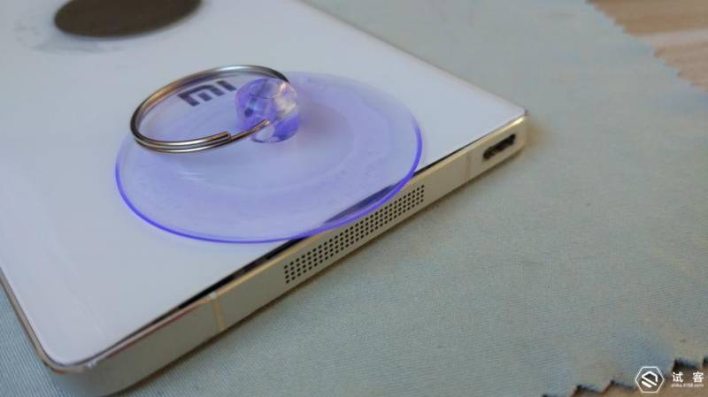 小米Note相对还是比较好拆的,但是由于后盖是玻璃的,所以一定要注意,吸盘最好从底部的扬声器位置开始吸,如果你的指甲比较长的话,可以用指甲沿着缝隙滑动,电池随带的金属桥板说实话不太好用。