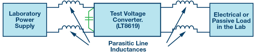 如果要测试电源对负载瞬变的响应速度有多快,则被测设计必须提供足够多的能量。被测设计输入侧的能量来源不应是限制因素。为确保不出现这种情况,建议在电源输入端放置一个较大容值的电容,如图1中的绿色部分所示。它确保负载瞬变测试可以正确执行。