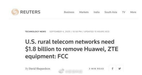 美国FCC委员敦促加码打压华为、中兴 预计将耗费1837亿美元
