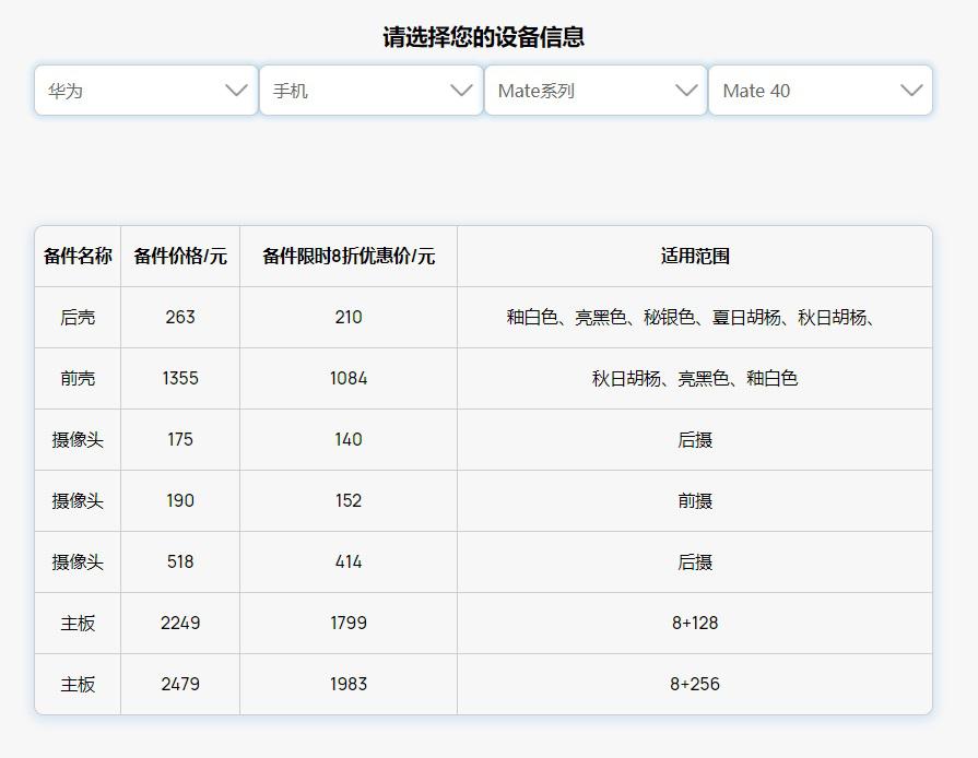 本次活动第一项内容为保外维修备件 8 折优惠。指定型号的产品部分配件如需更换,可享受 8 折优惠。IT 之家了解到,华为 Mate 30 手机后摄总成售价 494 元,前摄仅售 8 元,6 128G 主板售价 879 元。华为 P30 手机后壳售价 130-178 元,后摄 356 元,前摄 38 元。