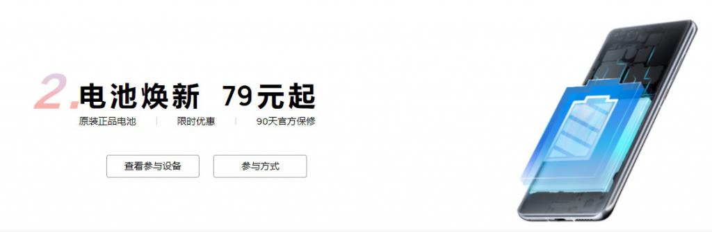 第二项活动为 电池焕新 ,多款手机、平板电脑产品在售后进行更换,价格 79 元起(含人工费)。活动内容为中国地区指定型号的华为、荣耀智能手机和平板产品。可以看出,大部分手机电池换新的价格为 79 元或 99 元,但不含华为 Mate 40 系列以及荣耀 V40。