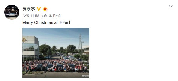 12月25日,贾跃亭在其微博上贴出一张在美国FF总部与员工的大合影,发文“Merry Christmas all FFer! ”,庆祝圣诞节。返回搜狐,查看更多