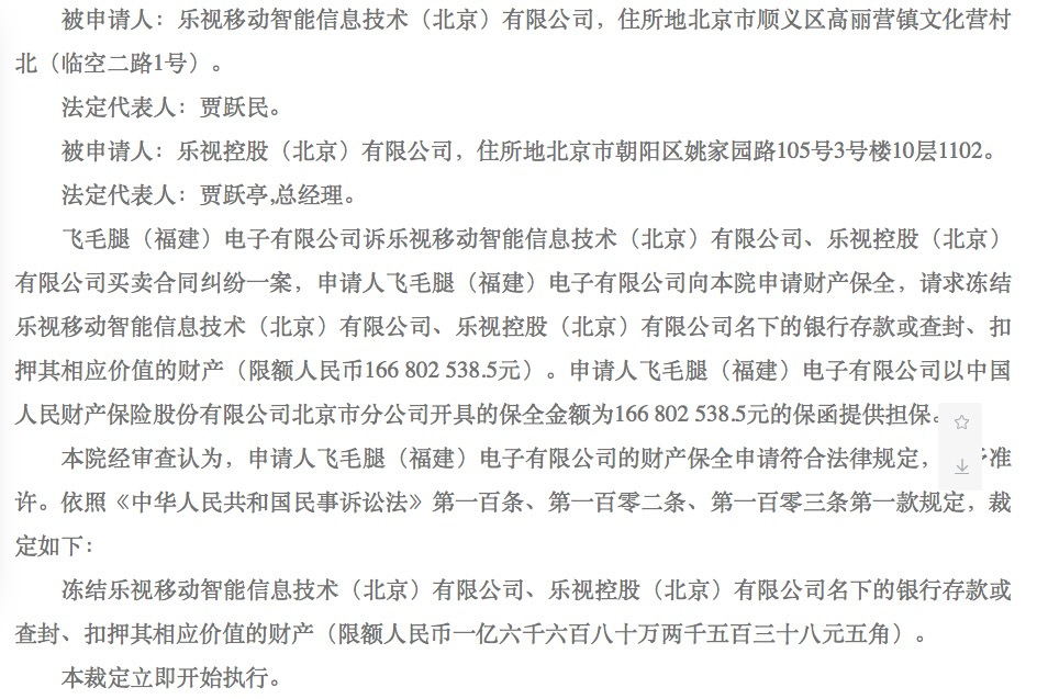 12月25日,搜狐财经注意到,北京法院审判信息网在12月22日发布了一则冻结乐视控股、乐视移动智能资产的裁定书。裁定书称,飞毛腿(福建)电子有限公司与乐视控股(北京)有限公司、乐视移动智能信息技术(北京)有限公司买卖合同纠纷,裁定冻结乐视控股与乐视移动智能名下的银行存款或查封、扣押其相应价值的财产约1.67亿元。