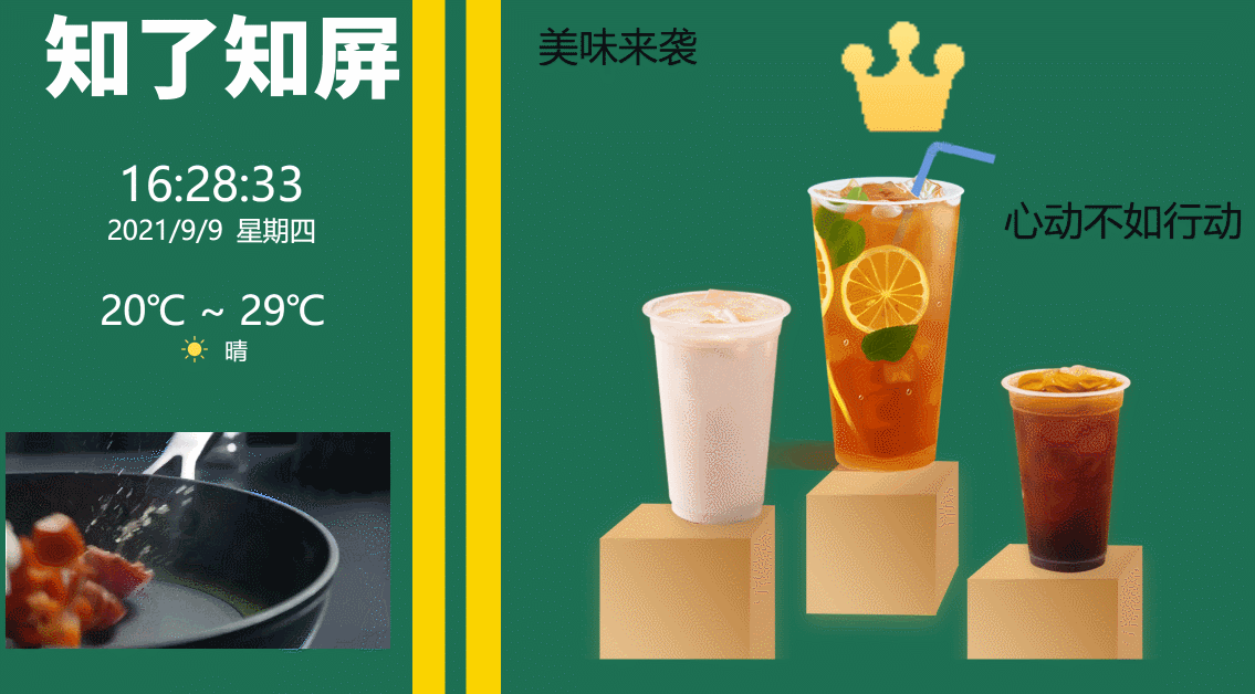知了知屏智屏小程序内含有多种组件,支持图片、视频的单播和轮播、图片视频同屏播放、也支持文字、浏览器、动画动效的播放,更有天气、时间小组件根据设备位置显示实时信息。在自由分屏小程序中可以自主规划屏幕,添加组件自由设计,无论是二分屏、三分屏、还是多分屏,都可以轻松做到。