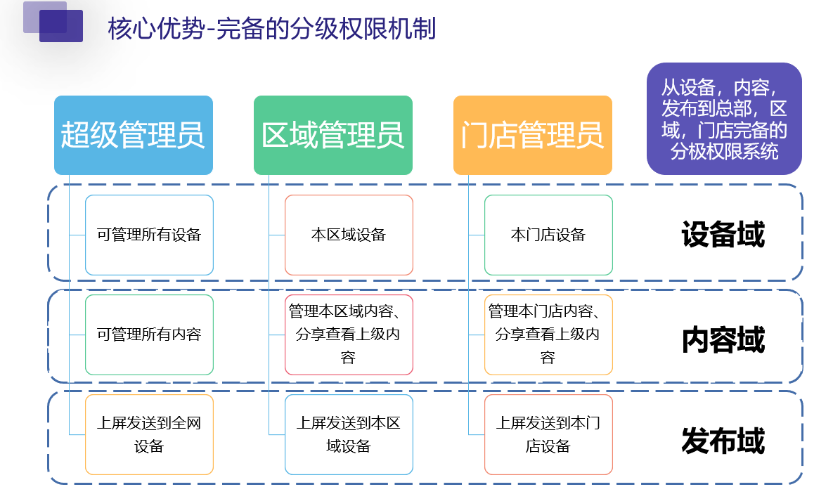 有些应用场景的小米电视遍布各地,不同区域有不同的发布需求。知了知屏管理员权限分级功能支持用户创建总管理员、分区管理员、门店管理员等多个角色,自定义权限。因权限不同,上传的内容、发布、设备对各管理员的可见性也不同,既满足总部有统一需求时的发布,也方便区域管理员对各自负责区域的管控。