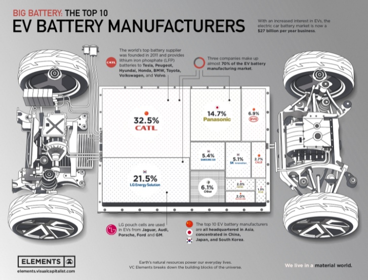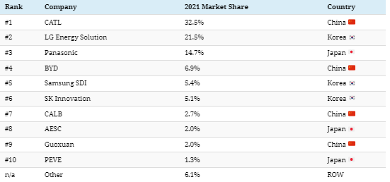 根据SNE研究公司的数据,前三大电池制造商CATL、LG和松下吞下了近70%的EV电池制造市场。
