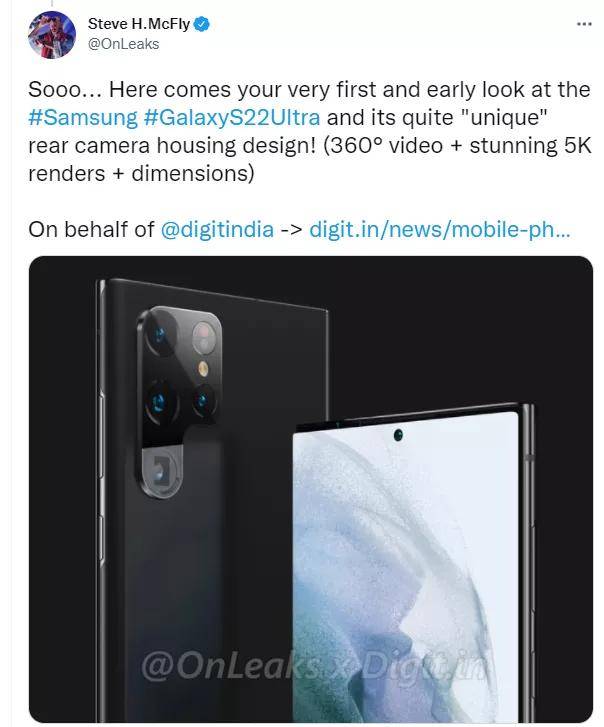 近日,三星 Galaxy S22 Ultra 渲染图出炉,该手机采用双曲面中置打孔屏,机身设计偏硬朗。