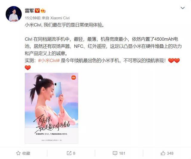 今天,小米官方再次对小米 Civi 手机进行预热。官方表示,小米 Civi 将是今年发布的续航时间最长的小米手机。