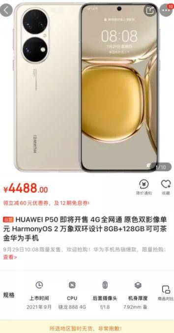 近日,华为 P50 已经在天猫、京东等平台上架,将于 9 月 29 日 10:08 正式开售,4488 元起。