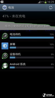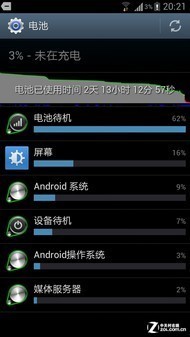 下面的电池曲线图可以比较明显展现三星GALAXY S III的续航能力。可以看到,在下午4点29分时,三星GALAXY S III电力为41%(此时电池就已经在网络待机情况下使用了2天9小时55分59秒),此前屏幕开启累计时间为1小时44分4秒;此后我们在开启Wi-Fi情况下高强度测试三星GALAXY S III,结果在晚上8点21的时候,其电力跌至3%,相当于在这接近4小时时间内,三星GALAXY S III电量下降为39%(尽管屏幕开启时间大约1小时,但黑屏时CPU仍在进行音乐播放等重度任务),此重度使用环境下,它应该能保证10小时续航,估算起来正常使用1天以上是没什么问题。说实话尤其是它的网络待机电力消耗之少让人惊讶,比我自己的GALAXY Nexus好了不少。