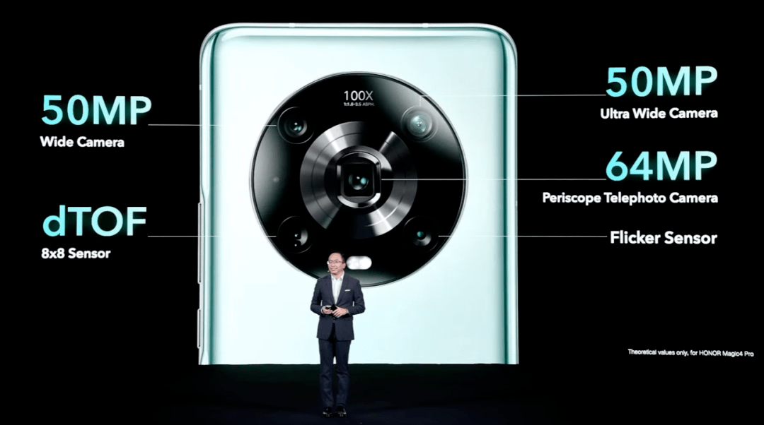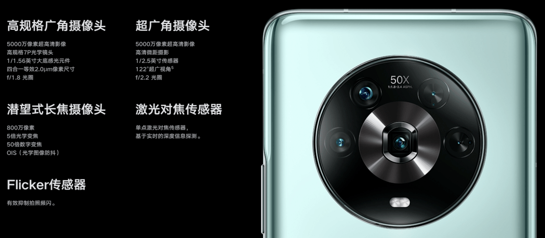 影像方面也是重头戏,Magic4 系列依旧保持了上一代的堆料特性,其中 Magic4 采用了 5000 万像素主摄 + 5000万像素超广角 + 800 万像素 50 倍潜望式镜头的组合,以及抑制频闪的 Flicker 传感器和激光对焦传感器。