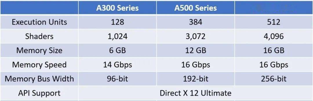 比如之前曝光的 A300 、A500 和 A700 系列就有着完全不同的单元和核心,分别对应 512 、384 和 128 单元。