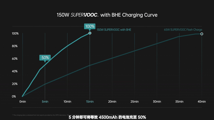 除了240W超级闪充,OPPO还同时发布了长寿版 150W 超级闪充,沿用 OPPO 电荷泵直充技术, 5 分钟即可将等效 4500mAh 电池容量的手机从 1% 最高充至 50%,最快 15分钟充至 100%,目前市面上最高的手机充电功率也只是120W,这次OPPO长寿版 150W 超级闪充也非常亮眼。