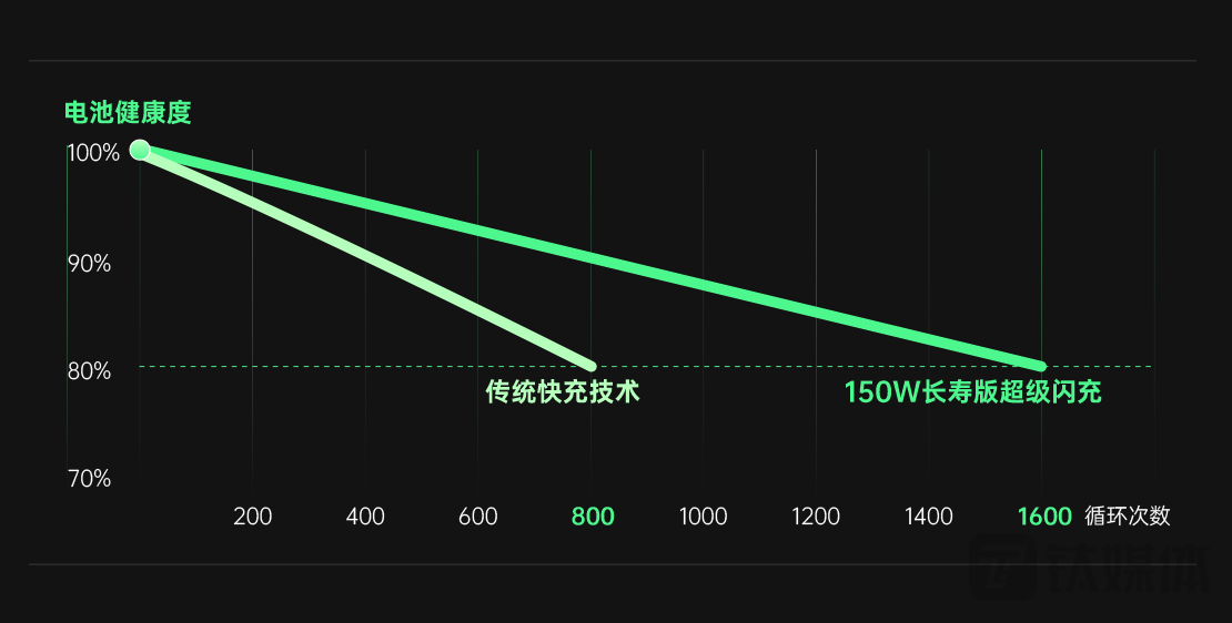长寿版150W超级闪充在提升快速充电功率的同时,搭载OPPO自研的电池健康引擎,更加注重减少电池寿命在快充过程中的损耗,一般手机电池在循环800次快充后,电池健康度就会下降至80%,而OPPO的150W长寿版快充可以将循环次数提升至1600次,足足翻了一倍,这将很大程度上扭转消费者对于“快充伤电池”的印象。