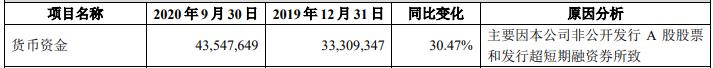 中兴通讯2020年三季报显示,截至2020年9月30日,中兴通讯货币资金余额435.48亿元,同比增长30.47%。主要因公司非公开发行A股股票和发行超短期融资券所致。