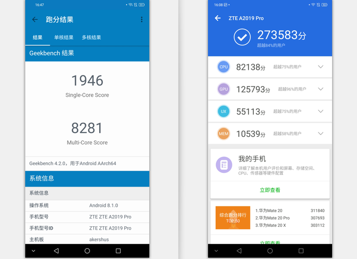 配置方面搭载了旗舰处理器,让我们来看一下安兔兔和Geek Bench的跑分。两款软件的跑分都属于骁龙845正常水平。