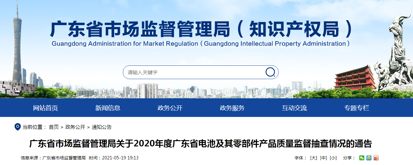 中国质量新闻网讯 近日,广东省市场监督管理局发布关于2020年度广东省电池及其零部件产品质量监督抽查情况的通告。
