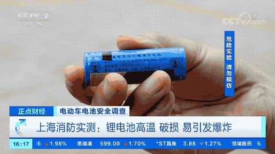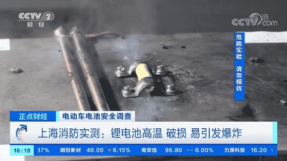 上海消防工作人员说,除了高温外,锂电池的破损、挤压也是引发电动自行车起火的重要原因。记者来到位于临港新区的上海防灾救灾实验室。实验区内,工作人员将一根钢针匀速刺穿单芯锂电池,记者看到几秒钟后电池开始冒烟并伴有射流火,随后形成了爆炸。