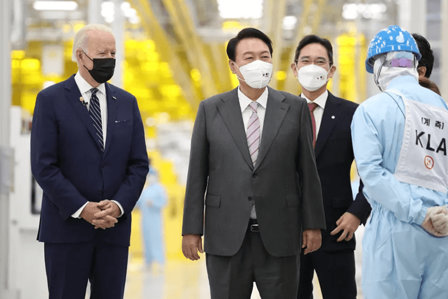 5月20日,拜登抵达韩国后,第一站就是参观三星半导体工厂。当天,拜登同韩国总统尹锡悦一道视察位于京畿道平泽的三星电子半导体工厂。该工厂面积相当于400个足球场,是全球规模最大的半导体工厂,不仅生产新一代存储芯片,还制造超微硅晶代工产品。尹锡悦表示,半导体是无人驾驶汽车、人工智能和机器人等所有尖端产业的核心零部件,也是决定未来技术竞争力的关键要素。韩国在全球存储半导体供应中占比达70%,扮演着半导体全球供应链的核心角色。