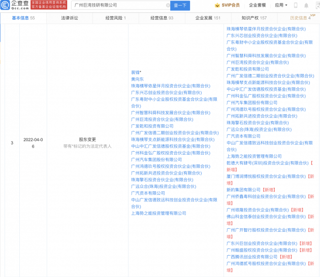 【TechWeb】4月8日消息,企查查APP显示,4月6日,广州巨湾技研有限公司发生工商变更,新增广西腾讯创业投资有限公司等多名股东,同时公司注册资本由7261.7万元人民币增加至8031.44万元人民币,增幅10.6%。