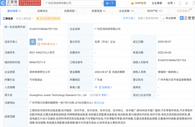 企查查信息显示,该公司成立于2020年,法定代表人为裴锋,经营范围包含:电池制造;新兴能源技术研发;软件开发;电机及其控制系统研发;集成电路芯片设计及服务等。