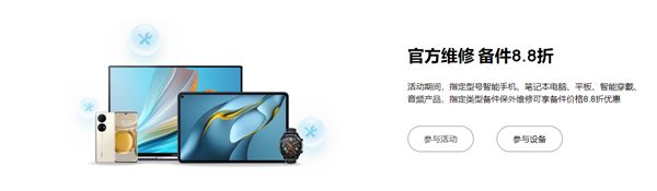 据介绍,在活动期间,指定型号智能手机、笔记本电脑、平板、智能穿戴、音频产品,指定类型备件保外维修可享备件价格8.8折优惠。