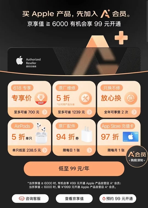 你看京东甚至还专门给苹果产品单开了一个 A+ 会员体系,开通之后可以享受折扣、只换不修之类的权益。